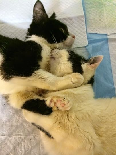 It was my older daughter who took over his rehabilitation; she also renamed him Baby. He was so debilitated, it was months before he could walk without falling over, or jump again. But we came to realize that, in truth, we should have named him Buddha Cat, because he was a very evolved soul—endlessly patient, kind, and loving and giving to both people and the other cats who came into his life. Here he is cuddling our cat Nick when Nick was dying of kidney failure a few years ago…