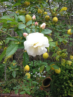 The above photo of is of the climbing rose that grows up in my lemon tree. My roses are covered with buds and my lemons and oranges are almost ripe, so I really, really hope this nasty weather headed our way doesn't bring us a freeze.