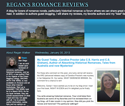 I'll be doing a guest interview on Wednesday, 30 January, at Regan's Romance Reviews. I'll be talking about my old historicals, but also about the Sebastian series. I'll be available to answer questions in the comments section, and you can even enter to win an ARC (Advance Readers Copy) of What Darkness Brings.