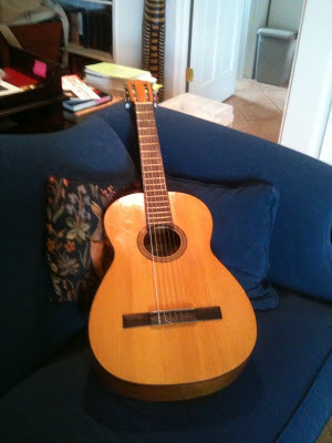 I used to play the guitar when I was in high school, and I've long regretted letting it slide out of my life. I was never very good at it, since I have no ear for music, no sense of rhythm, and I'm as uncoordinated as hell (watching me try to play tennis has been known to reduce onlookers to hysterics). But it was fun, and when I recently expressed a wish to start up again, my daughter stole away my old guitar, had it refurbished and restrung, and presented it to me for Christmas. So for the past week I've been tormenting my family with my hesitant strumming and s-l-o-w picking, and having a giddy time.