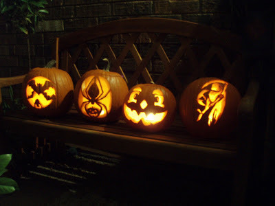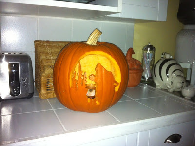 And here is this year's pumpkin. I tried to take a photo of it lit but I couldn't get it to turn out right. I guess I should have taken it outside like the ones above, but it was COLD out there! Thankfully by tonight it had warmed up enough that we could open the door for the trick-or-treaters.