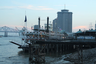 Then we'll cross the street and climb over the levee to the Mississippi River, where the steamboat, the Natchez, is decked out for the holidays.