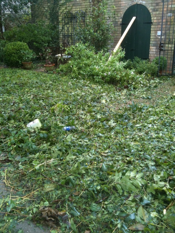 I have written almost nothing in the past week. Sunday and Monday went to storm preparation. I think I managed to scribble 4 pages on Tuesday before the winds got so high that I couldn't focus. Then it was too dark (no electricity+storm shutters on the windows=dark house), and I spent most of my time simply listening to our little hand-cranked radio (note to self: buy new batteries before the next storm). We've spent the last couple of days trying to clean up, and it will probably take at least another week. Now that we have power, we can get to work cutting up the downed trees and trying to do something about the downed fence. Everything is still such a mess; hurricanes strip the leaves (and lots of branches) off the trees and plaster them everywhere. You can barely see the walk to my front gate buried beneath the leaves and trash: