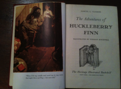 One of my favorite books growing up was The Adventures of Huckleberry Finn. My older sister checked it out of the library and first read it to me when I was seven, but I enjoyed the experience so much that I immediately sat down and reread it myself. Then our new lab puppy gnawed one end of the cover, so we had to buy the book from the library and it became ours. At the time it seemed a calamity (money was tight in those days, as my dad was in grad school) but it was really a gift. And since it’s one of the old 1930’s copies with the Norman Rockwell illustrations, I’m still glad to have it, chewed back cover and all.