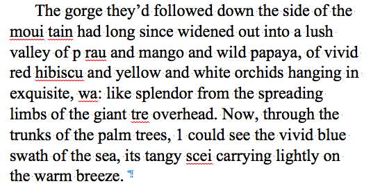 I decided to start with Midnight Confessions and Beyond Sunrise. Their galleys and copyedited pages drowned in Katrina and the files were zapped into nonexistence by last year's Great Computer Crash. So I had the paperbacks scanned. Some people have great success with this process. Here's a sample of what I got back: