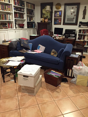 My office clean-up in progress; normally I have a carpet in front of the sofa, but it's rolled up at the moment.