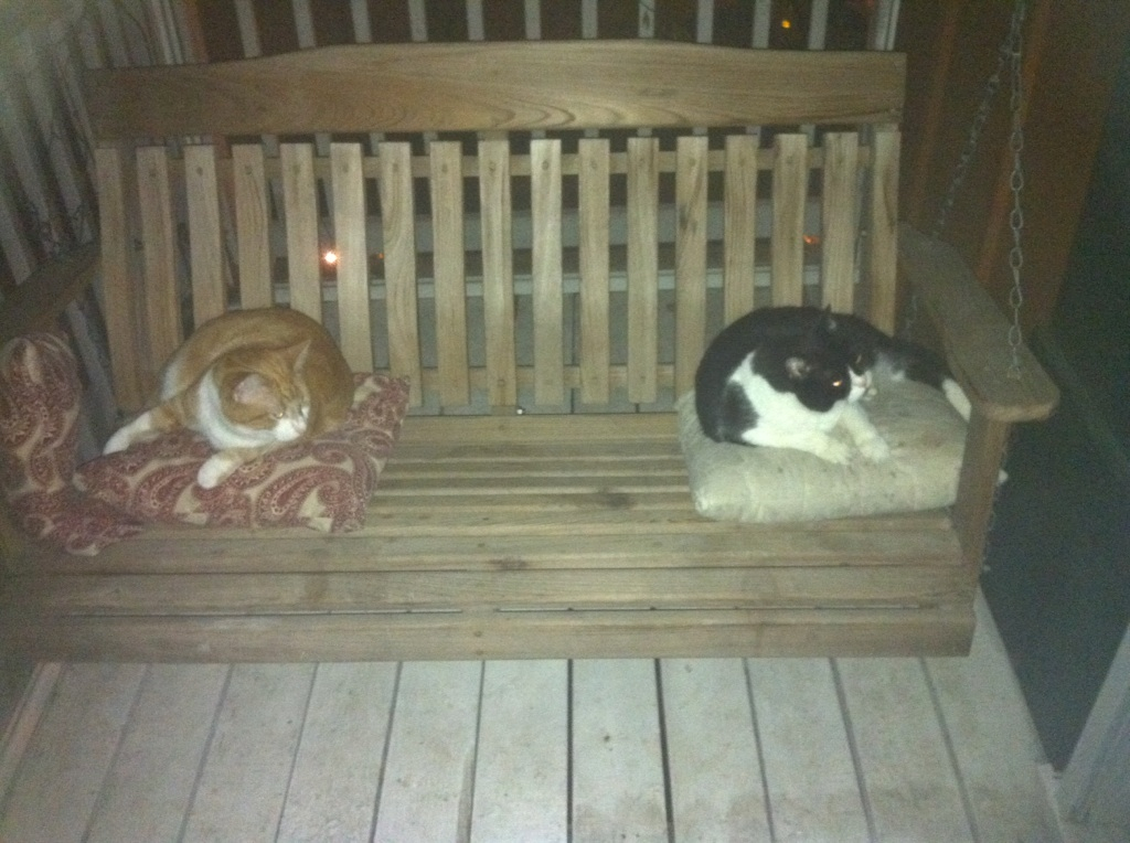The rest of the guys aren't much trouble. Thomasina, the calico female in the bottom bunk in the picture above, now spends most of her time in Baton Rouge with my younger daughter. I feed and cuddle the rest of the gang first thing in the morning before I go for my walk (Huck and Angel get a med that needs to be sprinkled on wet food). In the evening, before I go to bed, I sit with the Marmalades again for a couple of hours and read (Roscoe and Peanut live in a part of the upstairs that is closed off by a glass door because Huck doesn't like them) while Steve goes out and sits and reads with the Pee Cats (Nora and Whiskies live on our fifty foot screened in gallery because they have "elimination issues"). Angel and Huck (and Tommy Girl when she's here) are free to roam the rest of the house (Huck doesn't like Angel, either, but Angel can hold his own), and they cuddle next to me (or ON me) during the day while I write.