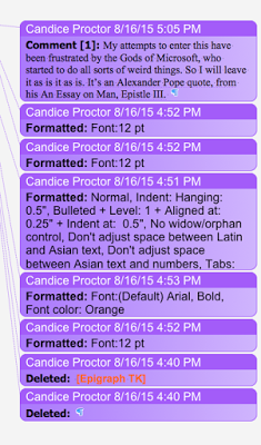 The reasons are myriad. A story read in fits and starts while constantly stopping to study little bubbles in the margins and endlessly analyzing word choices inevitably ends up sounding stilted and less than engaging; as a result, I start to worry ("OMG; this book is terrible!"). In fact, there's an entire gamut of emotions that accompanies the copyediting process, everything from humiliation ("I can't believe I wrote then instead of than! Where was my brain? How could I have done that?") to frustration ("Doesn't that %$#@ copyeditor know that the 'r' in River Teme is capitalized? Are you telling me I need to comb through this entire manuscript to find all the places she 'fixed' it so I can change them all back? Grrrr.") to fear ("Oh, my God; I wrote Jacobin instead of Jacobite and SHE DIDN'T CATCH IT! If she missed that, what else did she miss?") In other words, it's flat out painful. And it takes forever: I've now been at this for twenty-five hours and counting. (Yes, I'm counting. And I want my weekend back.)