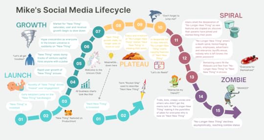 I’m not saying Facebook, Instagram, and Twitter have become zombies just yet. They still have billions of users and may yet extend their useful life. On the lifecycle chart, I’d put Instagram at Stage 8, Facebook at Stage 10, and Twitter tipping into the downward spiral of Stage 11 with Elon Musk shoveling stacks of money into the furnace to achieve failure even faster. But all of them will get to zombie status eventually, joining a long list of social networks before them. TikTok will end up there too before long.
