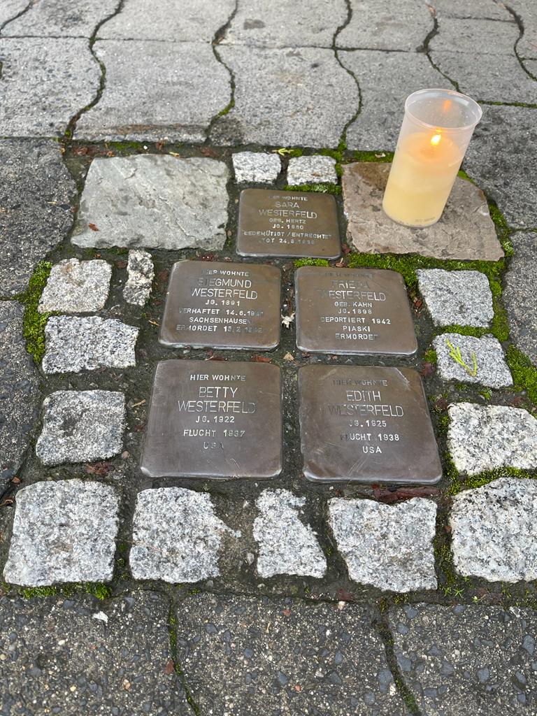 Every year for Totensonntag, a German friend takes her son to the stolpersteine that memorialize my family in Stockstadt am Rhein — my mother’s town. Totensonntag is a Protestant religious holiday in Germany and Switzerland that commemorates those who have departed. My friend sent me this photo this morning of the candle she placed at my family’s stumbling stones.