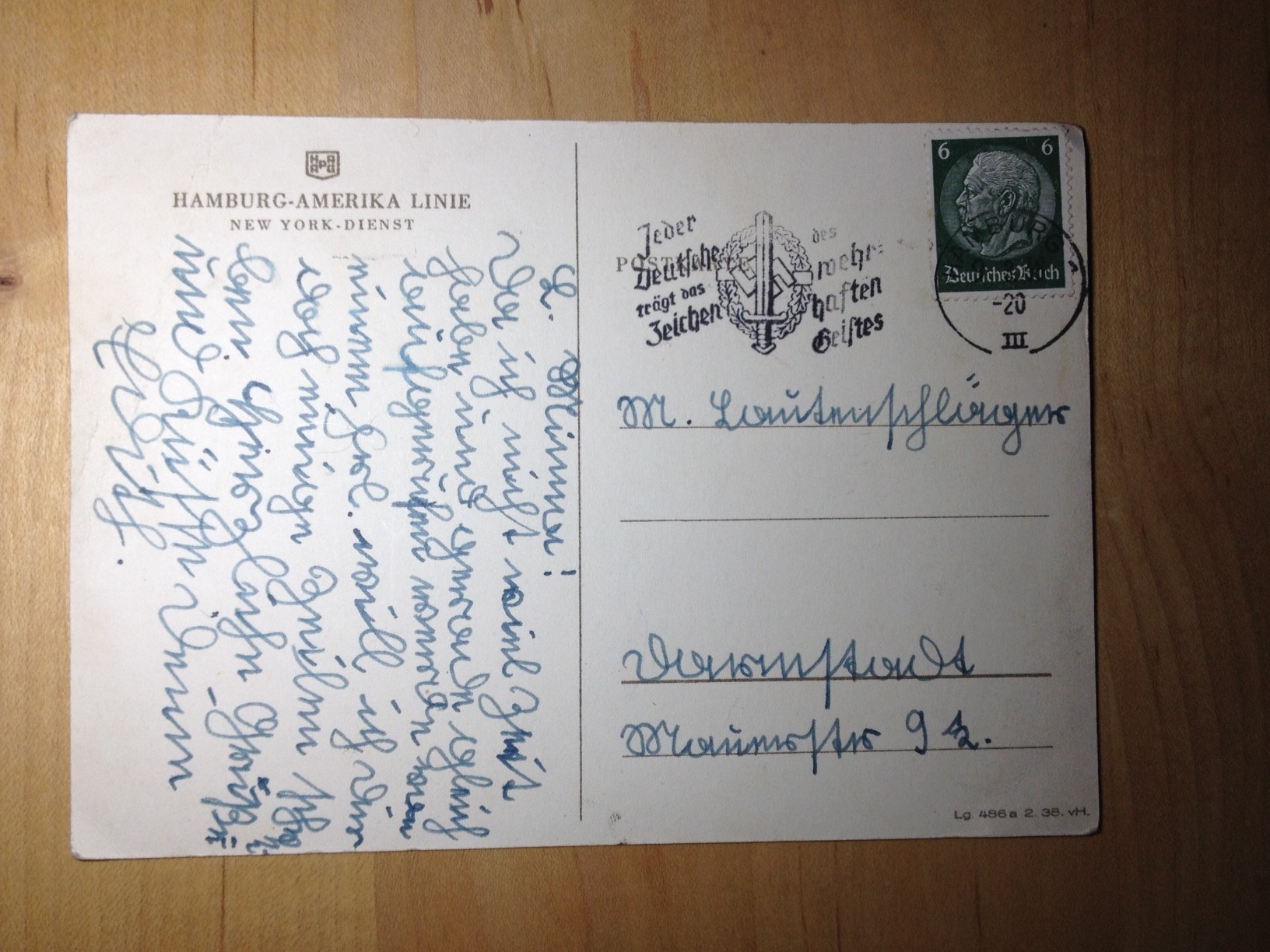 My friend, Jürgen Flügge (Mina’s son), just found an old suitcase full of postcards and letters from my mother, Edith, to her dear German friend, Mina. This is the first postcard 12-year-old Edith sent to 19-year-old Mina from the ship, the Deutschland, in March 1938! Here is what Edith wrote: My dear Mina, I don’t have much time. They are calling me. Just wanted to send you heartfelt greetings and kisses.