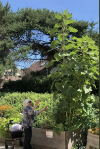 In my favorite photo of Mom, she is encouraging the sunflower she planted in “Oma’s Patch” to grow. And it did! It grew so tall that it towered over all the raised beds at her senior residence. That summer, her Jack-in-the-Beanstalk became a tourist attraction for residents and visitors.