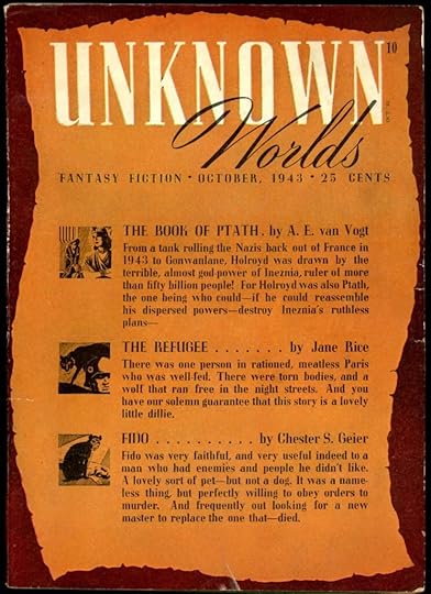Unknown Worlds, October 1943This story has a real pulp feel to it—the heroine, Milli, is in some meager circumstances in wartime France, dreaming of better days, when a naked young man appears in her garden. She is intrigued by him, and befriends him when he reappears the next day, even after we learn that a mysterious and brutal murder of a neighbor has happened the night before. Sounds like a bad idea, but Milli is undeterred. The young man eyes her hungrily and Milli finds him quite appealing, leading to some sensual dialogue and imagery. Milli leads him inside and they have an encounter that is not what you might expect; the twist ending is comical and left me wanting to read more by Rice.