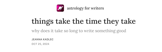 things take the time they take, an essay by — In a deeply personal, yet universal (for creative types), essay, Jeanna calls upon the wisdom of Saint Mary Oliver, “Things take the time they take. / Don't worry. / How many roads did St. Augustine follow before he became St. Augustine?” While this essay was written and published over a month ago, I find myself continuing to return to it as I wrestle with my own timeline demons. Perhaps you can take some comfort and witnessing in Jeanna’s words too?