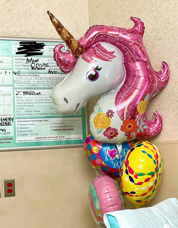 Esmeralda the Unicorn Balloon — I am so fucking lucky to have the greatest support system a girl could ask for, and to have received such an abundance of love and gifts from far and wide. Esmeralda, who was sent by one group of beloveds and named by another, has brought such joy, not only to me, but to nurses, doctors, and hospital volunteers alike! She’s deflating a bit now, but she’s still got some life left in her (just like me hehehe).