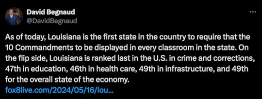 Why is this a terrible idea? Well, as the below tweet from CBS News Contributor, David Begnaud shows, states like Louisiana are already rank close to last in areas like health care, infrastructure, and overall state of the economy. Especially after this Ten Commandments ruling, it’s inane to think that if given the chance to take over the education system, it wouldn’t slip like the rest of the state’s statistics—not to mention devolve into even more religious and state propaganda.