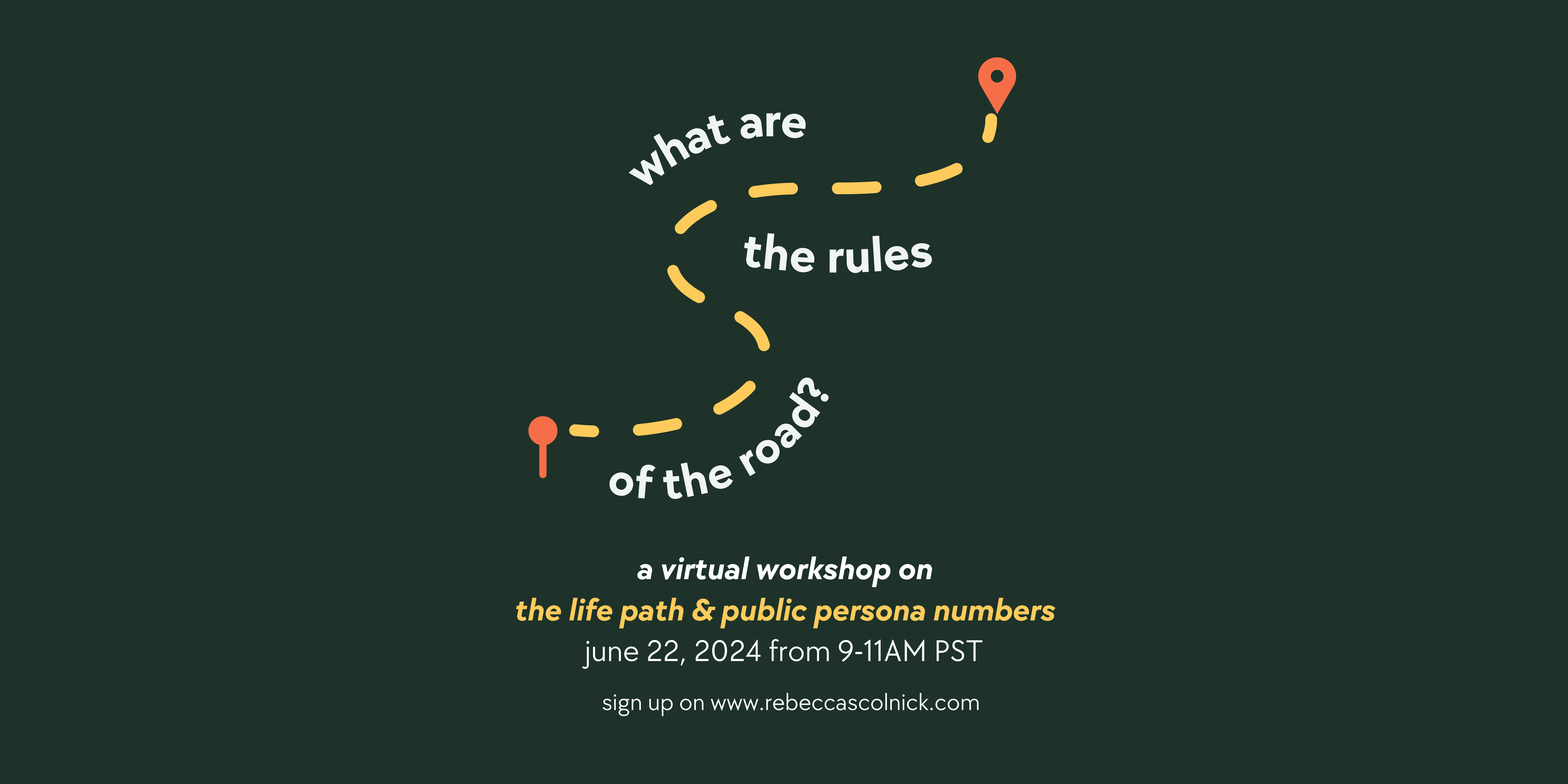 Today’s the last chance to sign-up for the live session of What Are the Rules of the Road, a 2-hour virtual workshop on the Life Path and Public Persona numbers. Replay available for those who cannot make it live, and you’ll receive a small discount for signing up for the whole 3-course trip.