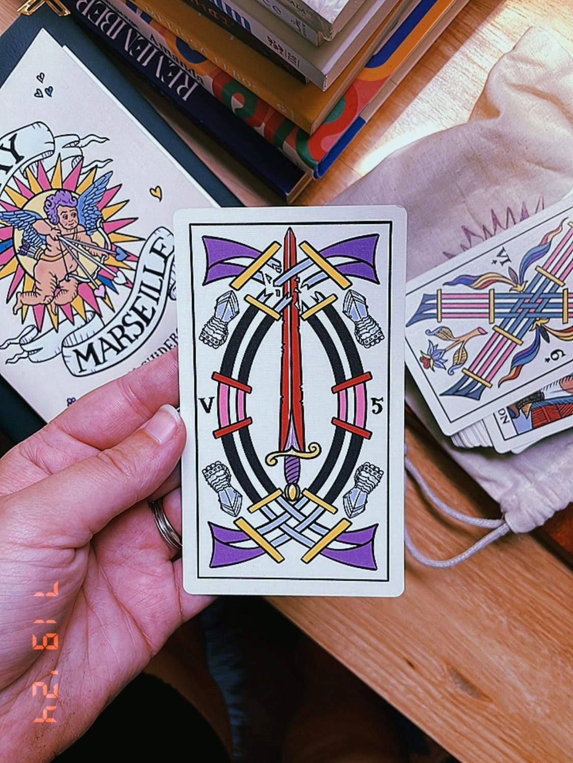 The 5 of Swords from the Gay Marseille Tarot by Charlie Claire BurgessIn the guidebook, Charlie writes that the 5 of Swords represents Mental Disruption, Force, Fighting, Cruelty, Pyrrhic Victory—one that is not worth the sacrifices made in battle. They tell us that the 5 of Swords may bring breakthrough, but it “does not come organically from within, as with the 3 of Swords. It comes forcefully from without, shattering perceptions” and “destabiliz[ing] preconceived notions of reality.”