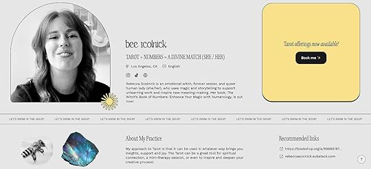 If you’re interested in slinging cards and/or chatting numbers with me, you can book with me online through my profile (pictured below). My calendar is open on Wednesdays and Fridays from 12-5pm PST, and the exchange is $75 for 30 minutes and $150 for an hour. I’m also offering personalized tarot lessons (during which we can also talk about numerology, astrology, etc.) at $200 for the hour.