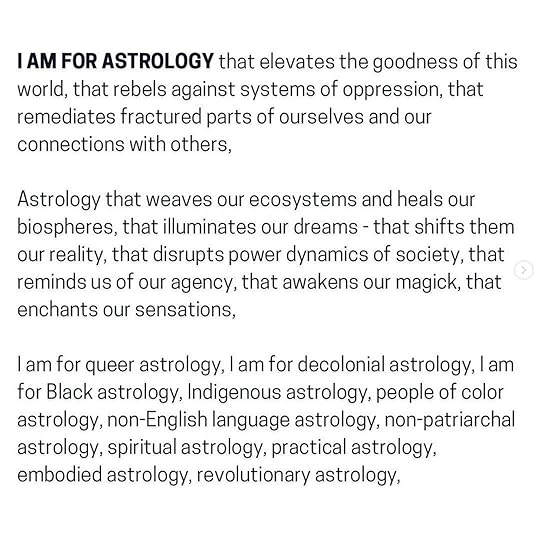 I AM FOR ASTROLOGY that elevates the goodness of this world, that rebels against systems of oppression, that remediates fractured parts of ourselves and our connections with others, astrology that weaves our ecosystems and heals our biospheres, that illuminates our dreams - that shifts them our reality, that disrupts power dynamics of society, that reminds us of our agency, that awakens our magick, that enchants our sensations.