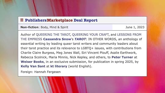 I have had the immense honor and pleasure of being asked to contribute an essay to Cassandra Snow’s TAROT: IN OTHER WORDS, and anthology of essential writing by leading queer tarot writers and community leaders about their tarot practice and its relevance to LGBTQ+ issues, with contributions from Charlie Claire Burgess, Meg Jones Wall, Siri Vincent Plouff, Asalie Earthwork, Maria Minnis, Nick Kepley, and other truly magical individuals.