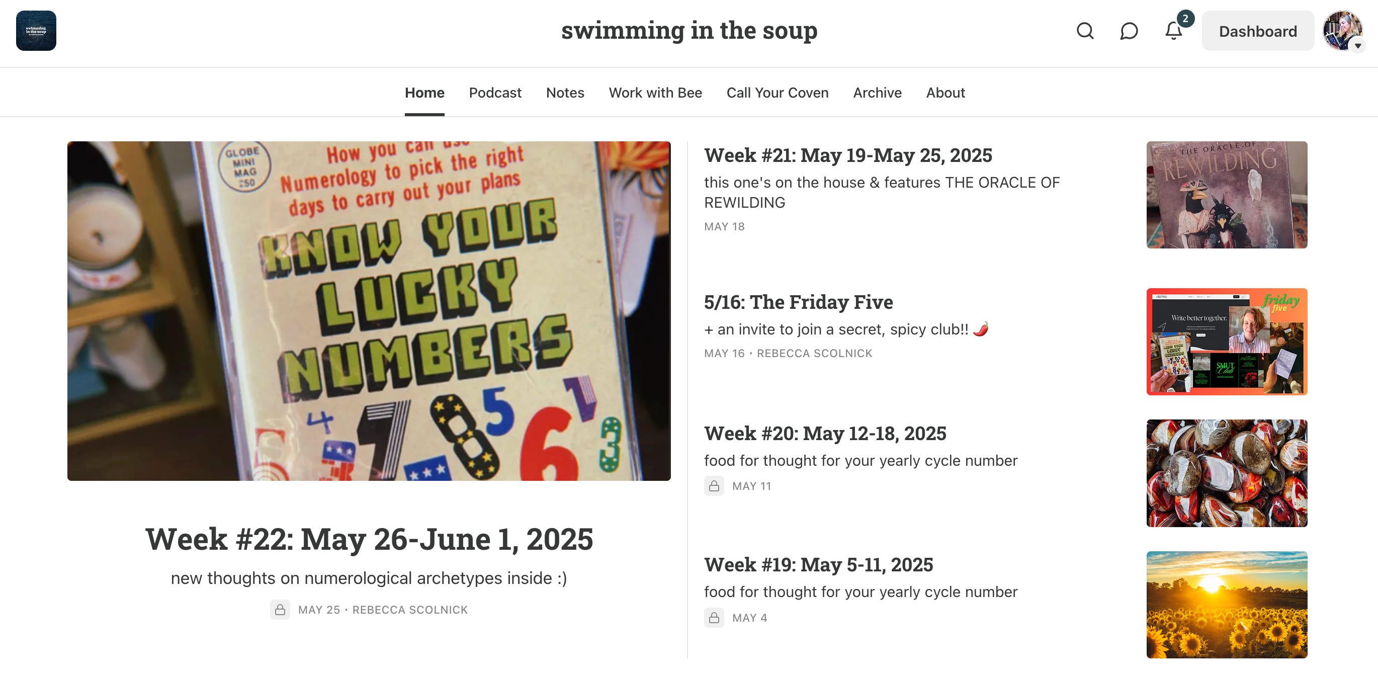 subscribe as a paid pal for weekly numerological forecasts for your yearly cycle number, quarterly insights from the tarot on the solstices and equinoxes, first dibs on future offerings, and access to The Soup™ Discord server.