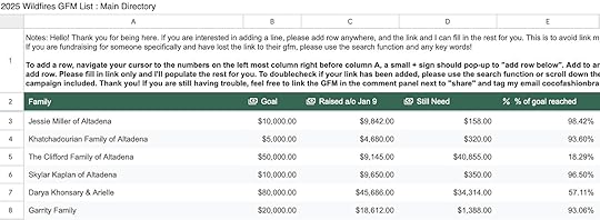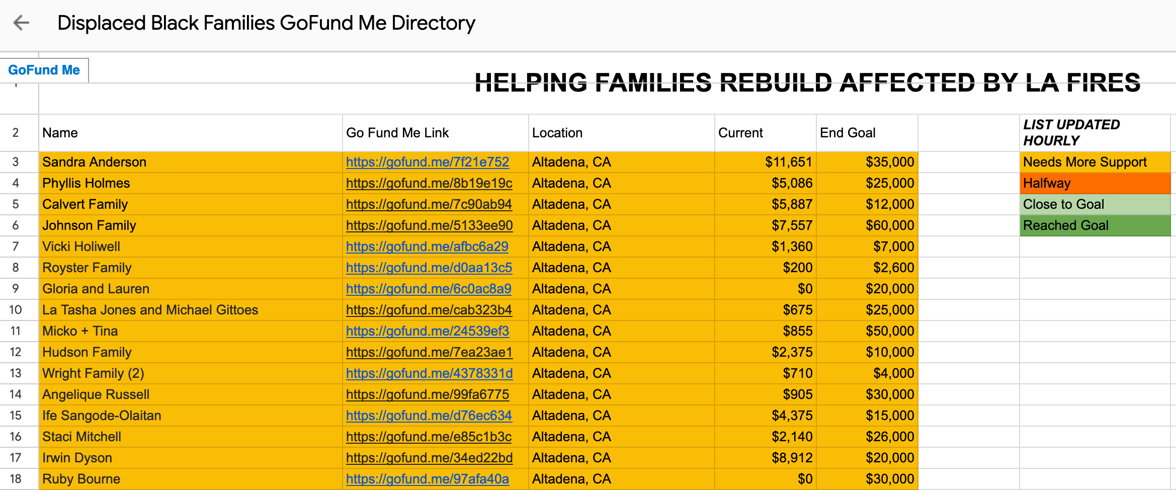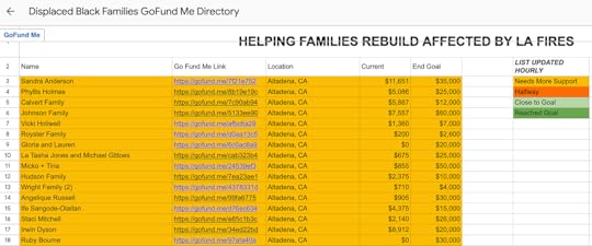 I also want to put one more on your radar—The Displaced Black Families GoFund Me Directory, most of whom are from Altadena, which was ravaged by the Eaton fire, but is not receiving the same media coverage as the Palisades fire. This spreadsheet lists the names of the family, the link to their GoFundMe, the current amount raised, and their end goal. It’s also color-coded according to how close each campaign is to meeting its goal, and is updated hourly!