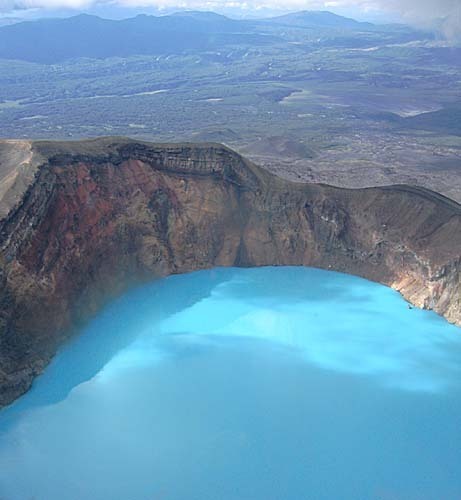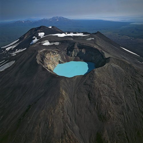 Karymsky Lake is a crater lake located in the Karymsky volcano in Russia. With a radius of 5 km it was once one of the world’s largest fresh water lakes, but as a result of a recent eruption toxic gases turned this into one of the largest acid water lakes.