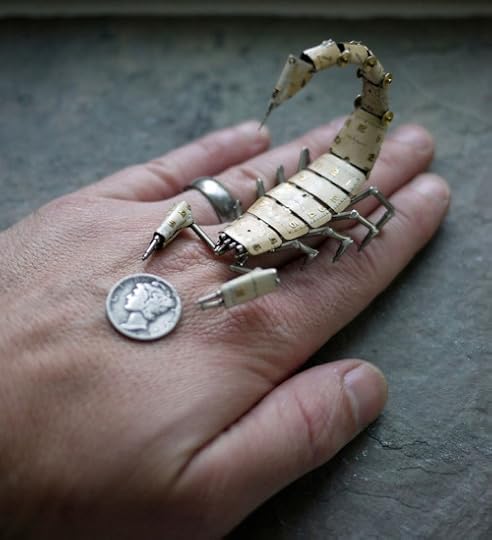 Chicago-based artist Justin Gershenson-Gates, also known as A Mechanical Mind constructs small steampunk insects by meticulously soldering together gears, springs and other watch parts. The robotic crawlers possess an intriguing quality, which unites life and machinery. Their long, thin metallic legs, fragile wings and clicking noise compose the ideal scenario for a science fiction horror film. You can find more of his eerie but beautiful creations on his Etsy shop.