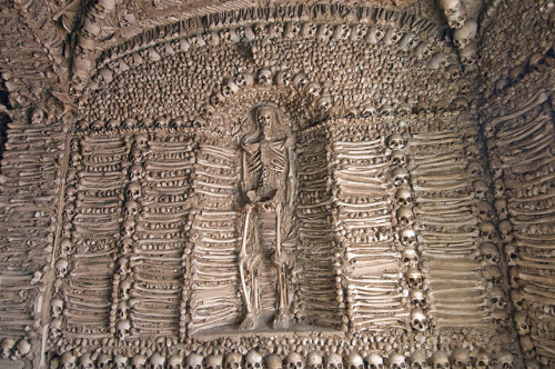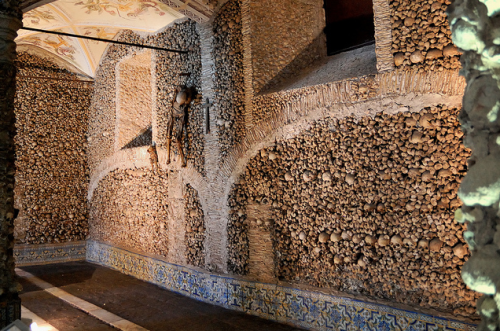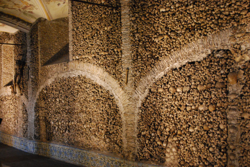 The Capela dos Ossos in the Church of St. Francis in Portugal seems to be made of bones. The very walls of the chapel have bones in them, with cement holding everything together. Even the pillars supporting the ceiling have skulls running up and down them.