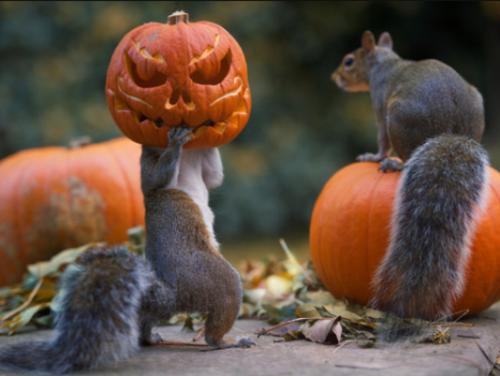 Photograph of a squirrel that got it’s head stuck in a jack-o-‘lantern