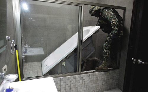 This bathtub in the house of Mexican drug lord Joaquin “Chapo” Guzman leads to an underground tunnel and exits through the city’s drainage system.