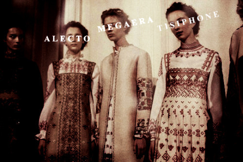 According to some stories, the Furies were sisters born from the blood of Uranus, the primeval god of the sky, when he was wounded by his son Cronus*. In other stories, they were the children of Nyx (night). In either case, their primeval origin set them apart from the other deities of the Greek and Roman pantheons.