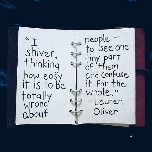 "I shiver, thinking how easy it is to be totally wrong about people - to see one tiny part of them and confuse it for the whole.” - Lauren Oliver