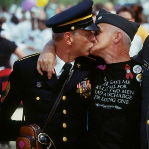 His shirt reads “They gave me a medal for killing two men, and a discharge for loving one.”