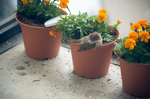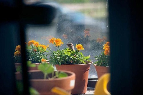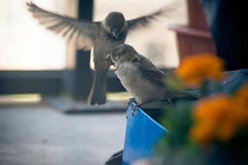 he was getting bigger every day, but he was still blind. i called a vet, and he told me to try simple eye drops. it worked like a charm! he even started hiding from us behind our flowers. soon, his father started showing him how to fly trough the window.