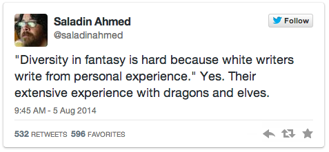 Also, when people do write about dragons and elves, they often rely on archetypes/stereotypes about those creatures, or completely make the information up without referencing other tales. This wouldn’t translate well into writing about a character of a different race/culture. If you relied on archetypes/stereotypes, as you do to write your fantasy creatures, you’d be accused of creating a one-dimensional character and stereotyping his/her race. If you made up the information completely, you would be accused of not accurately representing your character’s culture/experiences. It’s very difficult to create a protagonist whose life experiences you don’t understand. I’m currently attempting to write an Icelandic protagonist, and it’s quite difficult. Lastly, authors can write whatever they want. They don’t owe anyone anything. This is their story. It takes a lot of passion to write a story; you really have to get behind the plot and characters. Therefore, you can’t expect authors to write stories that cater to your interests, because the story has to suit their interests first. If you want to see a book with a certain plot or group of characters, write it yourself.