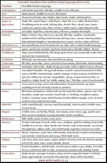 Below you will find a list different type of emotions and what sort of body language can be exhibited to them.