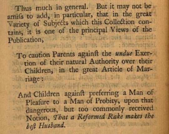 It seems that Bella is quite convinced of her sister’s infatuation, but Clarissa herself admits to only a ‘conditional liking’ — meaning, reduced to a circumstance of choosing between him and Mr Solmes, Clarissa can find enough to like about Mr Lovelace to make him a tolerable prospect. But will she really be forced into such a choice?