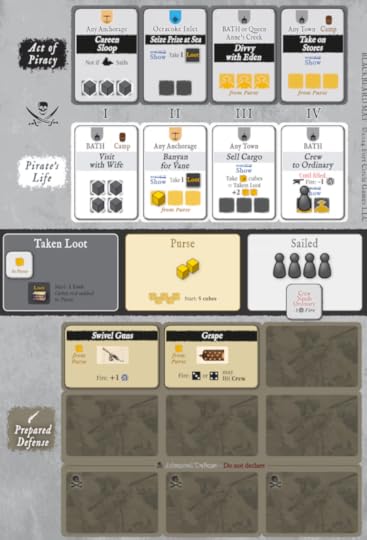Your sideboard as Blackbeard, you will become intimately acquainted with it. The top two rows track your two possible life paths, the middle shows your available resources, and weaponry goes at the bottom.