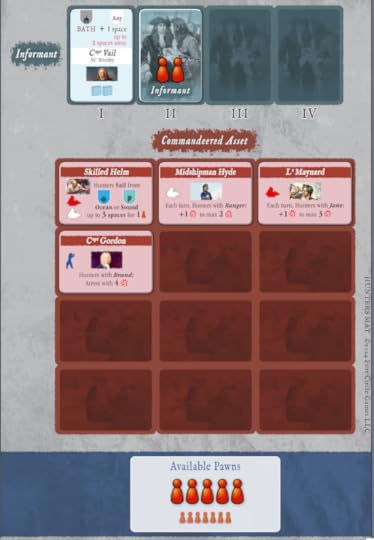 The Hunter’s sideboard. You can only commandeer equipment at your starting location, so you best pick what you’ll need for the whole game. You have more pawns than Blackbeard, but you have Informants to spend them on and three pieces to move so the costs quickly mount if you try and do everything.