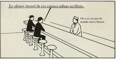 La philosophie comme dialogue de sourds? Prenez-en de la graine. En ce 4 mai, on ne va pas se mentir mais plutôt vous ôter une fière chandelle du pied : apprendre à mourir ne nourrit pas son homme. Raison de plus pour aller faire ses courses chez Nonédition, éditeur à vocation vocative – en cas d'urgence tirez sur la sonnette. Mais que dois parle-je? De petits livres stimulants, dont plusieurs font pâture de transcendance. Le coupable s'appelle Gilbert Z. Cram et s'il n'est pas mathématicien je veux bien boire l'eau de la Seine. A partir de dessins simplissimes prélevés dans une vieille grammaire américaine – deux types à chapeau face à face dans la rue, deux types à un comptoir face au barman, deux types dans une pièce, etc. – Cram leur colle un dialogue à deux temps, fonctionnant sur le moteur philo/trivialo (vous pouvez également suivre l'œuvre de Cram sur Twitter). Ici, un exemple m'évitera de redonder: