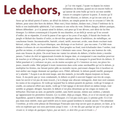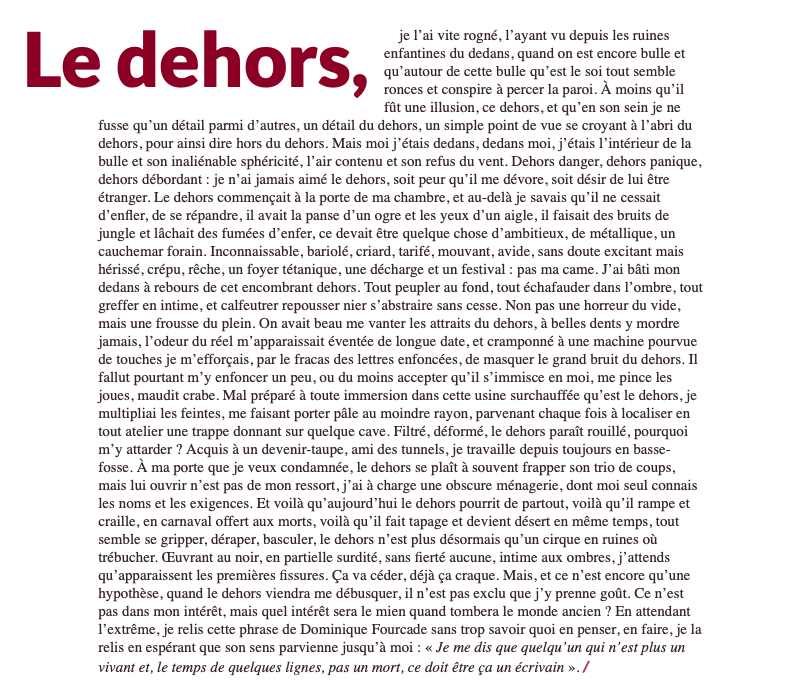 "Je te parlerai comme un long chien couché peut toujours se lever, je te parlerai comme l'humain surveille le chien couché qui sans doute va se lever, à tout moment se lever, je te parlerai comme le chien dort ici depuis deux heures, je te parlerai comme l'épicier en face sait bien lui que le chien ne se lèvera pas et d'ailleurs peut-être est-il mort",