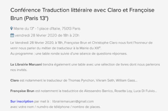 (Actes Sud), nous vous convions à une rencontre à la librairie Charybde, dans l'aire de lieu pluridisciplinaire et de bières de Ground Control, 81 rue du Charolais, 75012.La rencontre débutera à 19h pile, car nous devrons rentre l'antenne à 20h, donc si vous venez, soyez à l'heure ou restez chez vous pour regarder Netflix, hein.