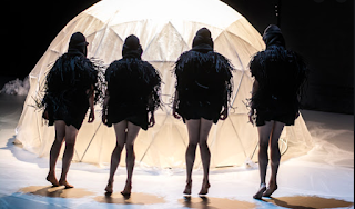 A l'Ouest – spectacle de danse signée Olivia Grandville qu'on peut voir actuellement à Paris au Théâtre de la Bastille jusqu'au 29 février – est né de l'entrecroisement ou plutôt de la collision de divers projets et événements. Au départ, il s'agissait d'échafauder à partir de la musique de l'artiste new-yorkais Moondog, mais au travail que faisait ce dernier sur la musique des pow-wow est venue se greffer l'histoire politique, à partir d'une manifestations de peuples indiens à Standing Rock. Le spectacle, bien sûr, ne se résume par la fusion de deux intentions – procéder à des variations chorégraphiques sur le pow-wow et réfléchir par l'image et le geste à la tentation de l'appropriation culturelle qui nous habite plus ou moins consciemment. Il fait vite éclater le carcan folklorique et la réflexion culturelle, pour offrir un vertige dansé, où le corps amérindien est traversé par d'autres pulsions rythmiques (hip-hop, danse bretonne, etc).Sur scène, autour d'un igloo en treillis métallique que viennent enneiger des bâches de plastique transparentes et au centre duquel brûle doucement le feu d'un téléviseur bloqué sur un paysage emblématique, cinq femmes – cinq esprits en quête de transe – martèlent la terre au son d'une musique (composée par Alexis Degrenier) qui procède par nappes et tourbillons, alentissements et vrilles. Des devenirs animaux traversent ces corps; les jambes, qui au début cisaillent l'espace tels des fléaux battant le blé (il s'agit de préparer le sol où danser en aplatissant l'herbe – la grass-dance est un des schèmes du pow-wow), deviennent vite des pattes d'étranges oiseaux – les danseuses portent un haut noir et frangé doré d'une cagoule à visière, un passe-montagne qui rend les visages indistinct, elles alternent et combinent plus d'une vingtaine de pas, s'esquivant toujours, chacune traversée par une expérience unique que chaque autre pourtant explore à l'identique. Electrons, élans, forces magnétiques et telluriques, possession et délivrance: la chorégraphie invoque tous les élémentaux, fait des corps une constellation fiévreuse d'échos physiques. Sidération, tremblement – et mystère.