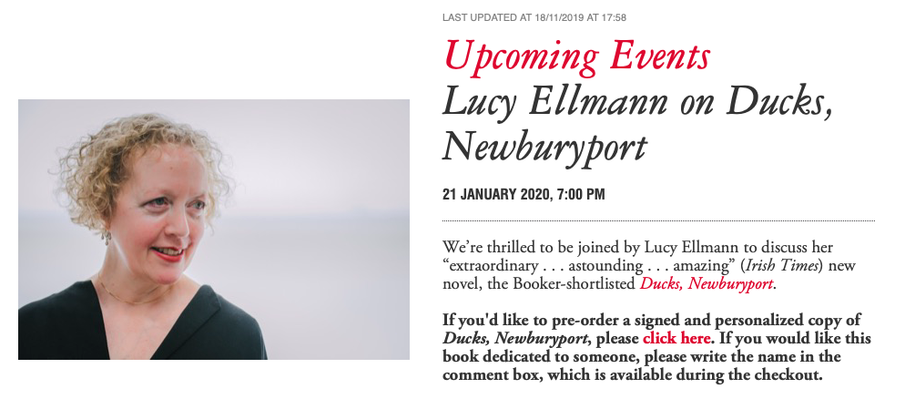 En attendant la publication du roman de Lucy Ellmann, Ducks, Newburyport, fin août 2020 dans la collection Fiction & Cie (éd. du Seuil, trad. Claro), les anglophones sont invités à venir rencontrer et écouter l'auteure à la librairie Shakespeare & Cie (37 rue de la Bûcherie, 75005) mardi 21 janvier à 19h.