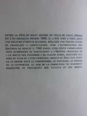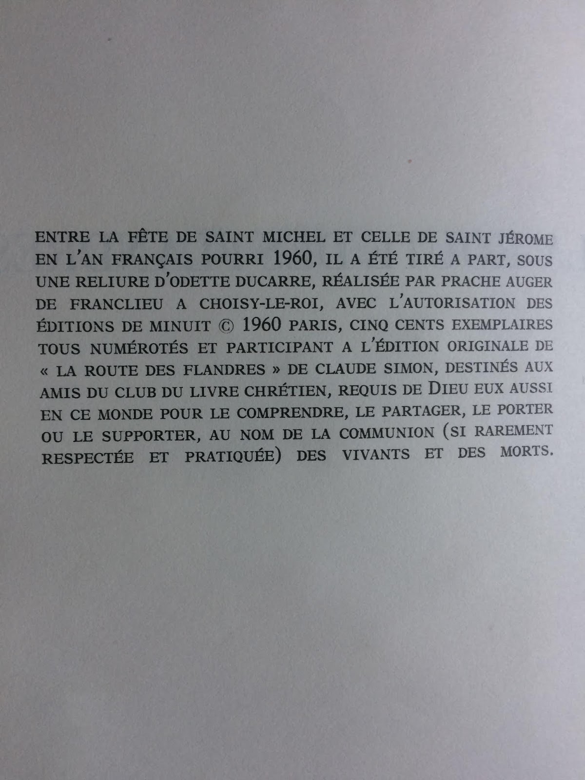 "Aujourd’hui je serais intimidée par l’idée d’habiller La Route des Flandres. […] Maintenant je pourrais faire une mise en page selon le rythme, la violence, l’érotisme, et la boue. Composée en caractères Garamond, italiques. La hampe des lettres est fine, les pleins et les déliés sont bien contrastés. Le galbe des lettres rondes est parfait. Je n’imprimerais pas le livre à l’encre noire. L’impression serait à l’encre rouge garance. Ce serait un livre sans couverture, sans habit, sans jaquette. Uniquement le texte. Nu. Complètement nu."