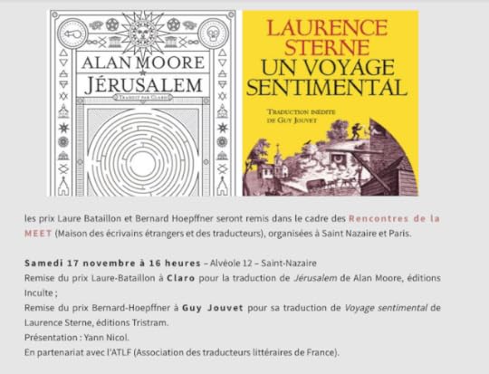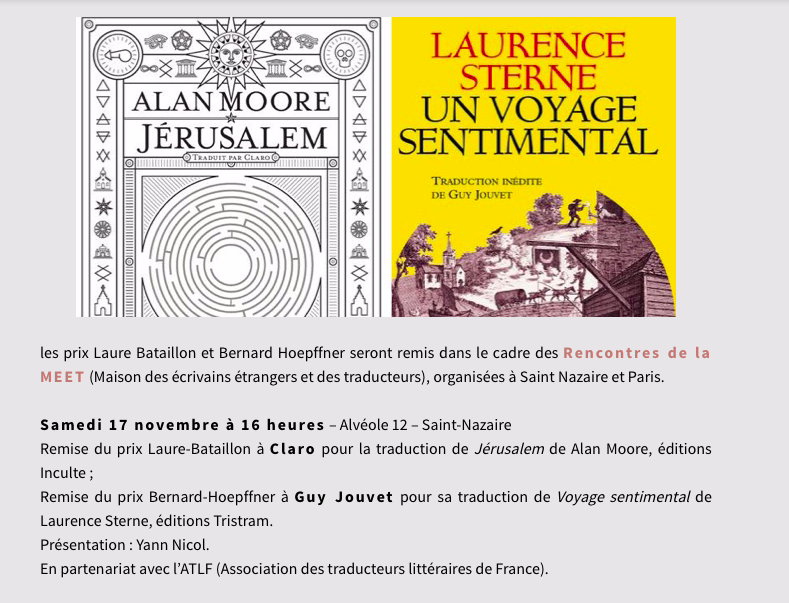 Jeudi 22 novembre à 19h (vérifiez quand même l'heure…), à la librairie L'Arbre à Lettres, 62 rue du Fbg Saint-Antoine (Paris), à l'occasion de la remise parisienne du prix de la traduction Laure-Bataillon (à Claro ((c'est moi)) pour la traduction de Jérusalem d'Alan Moore, éd. Inculte) et du prix Bernard-Hoepffner à Guy Jouvet (pour sa traduction du Voyage sentimental de Laurence Sterne, chez Tristram), vous êtes contraints de venir assister à une petite discussion décontractée avec les traducteurs susmentionnés, discussion qui sera animée (mais pas dessinée) par Alain Nicolas.Je vous parlerai de Lucia Joyce et des problèmes qu'elle continue de poser des années après sa mort et vous expliquerai pourquoi traduire est une perte de temps qui permet d'en gagner ; Guy Jouvet, quant à lui, vous parlera sûrement de la guerre des Flandres et de défluxion. Vous voilà prévenus. Un verre de l'amitié à 11° sera offert aux survivants.