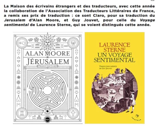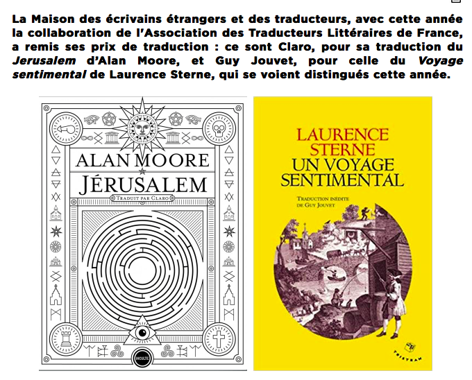 Le Prix Laure-Bataillon est attribué conjointement à l’écrivain étranger et à son traducteur en langue française. Il est doté de 10 000 €, remis pour moitié à l’auteur et pour moitié au traducteur.Le prix Bernard Hoepffner honore quant à lui la traduction d'un auteur décédé ou une retraduction. C’est donc pour la traduction de l’indispensable Voyage sentimental de Laurence Sterne, paru chez Tristram, que Guy Jouvet se voit distingué