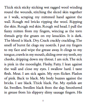"Poisse épaisse poisseuse empoissant la laine lourde engluée dans les plaies, mes pas pressés ravaudant ma peau fendue, ma mitaine humide raclant le mur. Briques rouges rêches déchirant la laine. Déchirant la peau. Peau rêche rouge. Tête rêche rouge. Je grimace en ôtant le gant plucheux, la laine lacérée érafle mes doigts meurtris. Il fait nuit. Le sang est noir. Sec. Grince grinçant grincement. Le relent de gras grillé m’obstrue les narines. Je porte mes doigts à mon visage, essuie le gras. Il colle à ma langue, glisse dans ma glotte, coule sur mes dents, mes joues, goutte au fond de ma gorge. Je vomis. Le vomi est rose au clair de lune. Charnu. Gras. Je m’appuie contre le mur, ferme les yeux. Ravale ma bile. Goût de chair. De viande. Je vomis encore. Mes yeux dansent. Éclairs roses. Retour au noir. Le corps racle la brique. Je vois noir. Noir poix. Gras. Mes paupières sont grasses. Enflées. Noires et gonflées par les gifles."